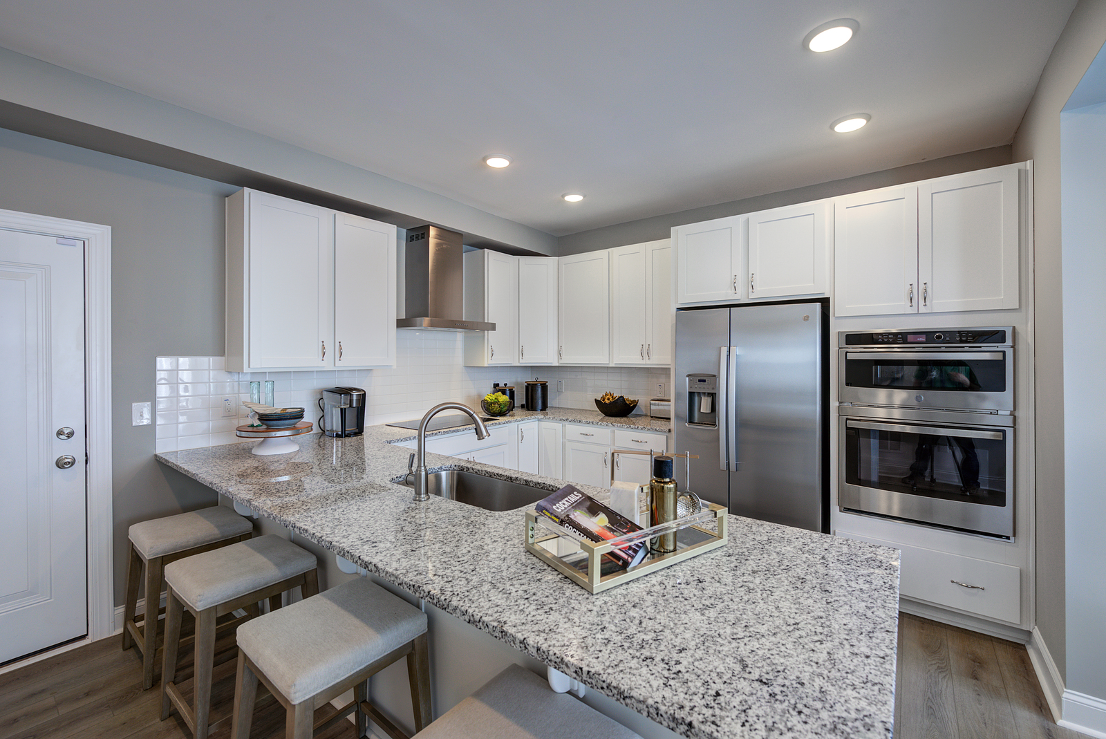 Gourmet kitchen with white designer cabinets + Stainless Steel appliances