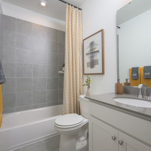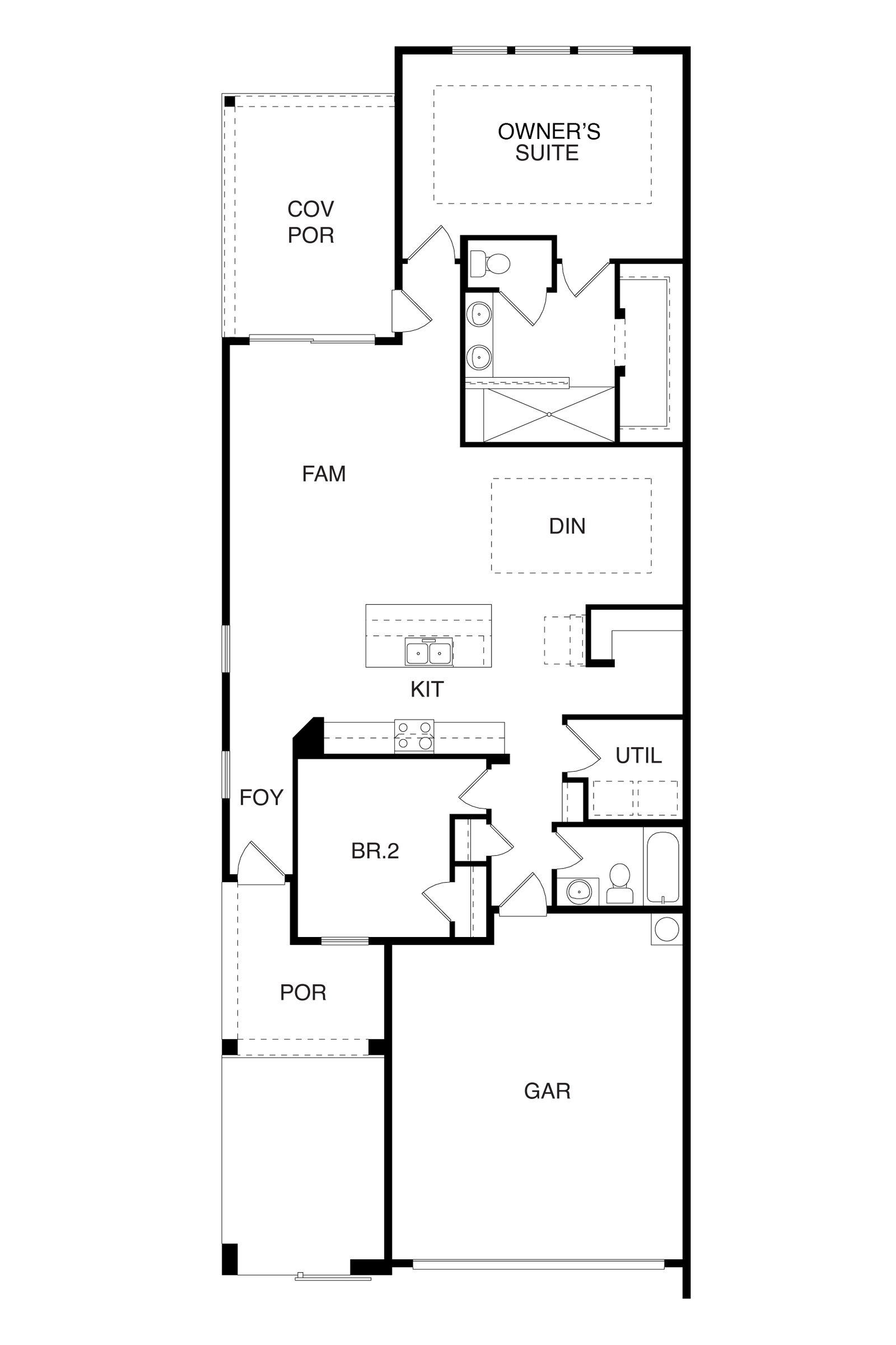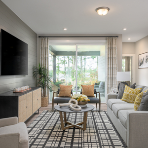 Natural light fills the open-concept kitchen, dining and family area of this single-story paired villa, and pops of yellow enhance the warm, inviting atmosphere.