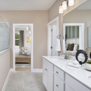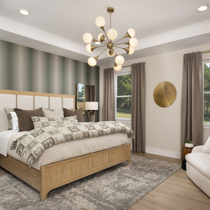 • First-floor owner’s suite with tray ceiling, accent wall, and spa-like super shower