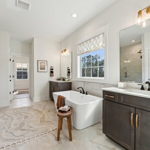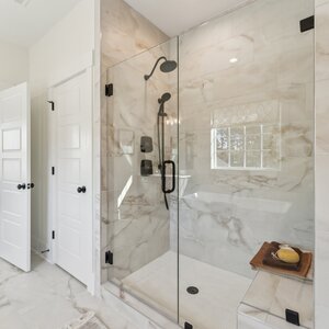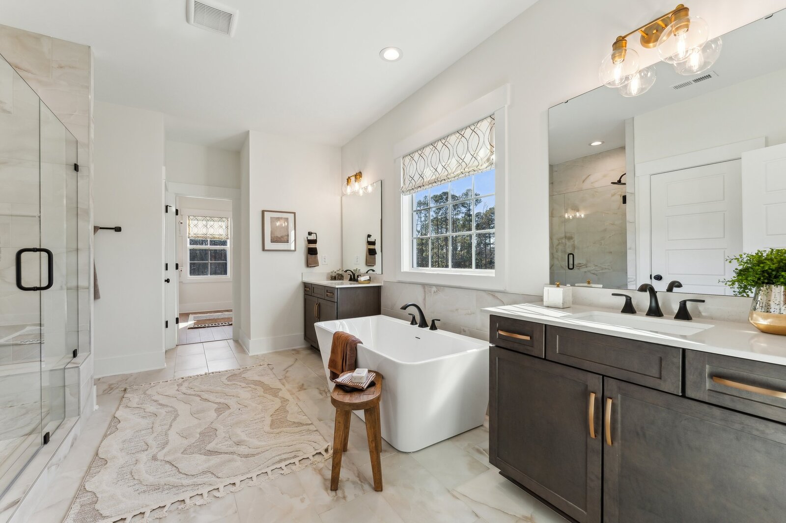 Primary Bathroom with double vanities and beautiful ceramic tile shower