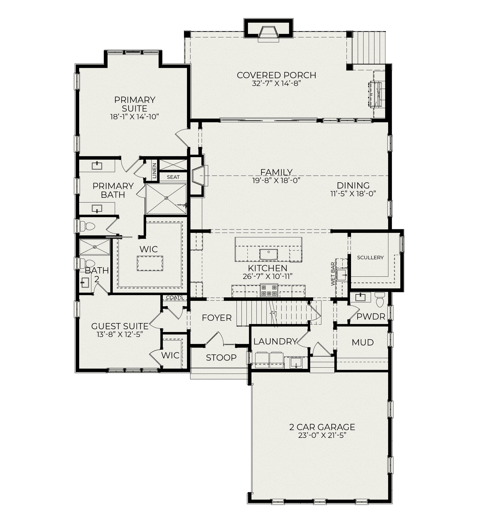 The Catherine Plan is a custom-designed and professionally staged home that blends elegance with everyday comfort. Featuring 4 bedrooms, 4 full baths, and 2 half baths, it offers spacious living and refined finishes throughout. The main floor includes a serene owner’s suite with a custom walk-in closet, a guest bedroom, and a gourmet kitchen with a scullery, mudroom, and laundry. Vaulted ceilings elevate the family and dining areas, while the upstairs includes a study, walk-in attic, and a rec room ideal for a golf simulator or media space. A covered back porch with a fireplace and beautifully lit landscaping complete this stunning home.