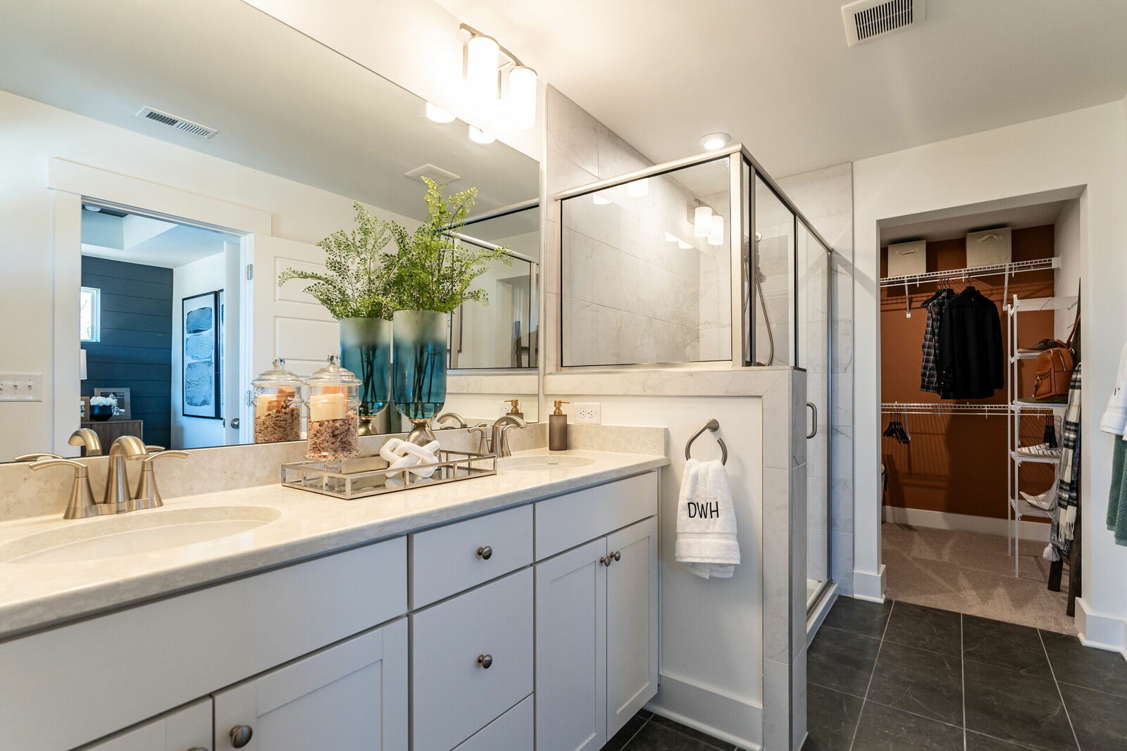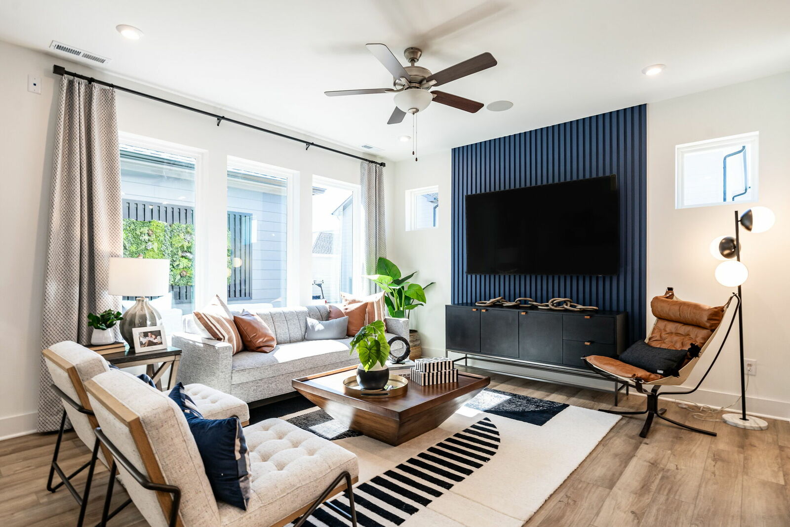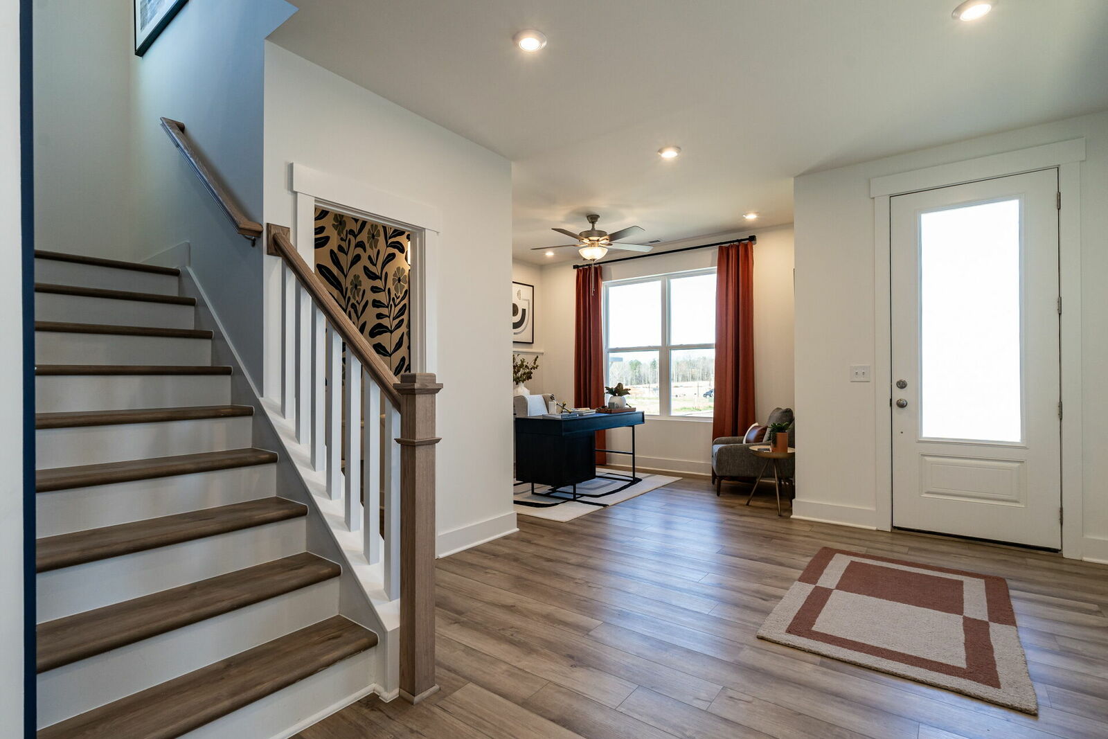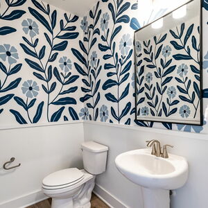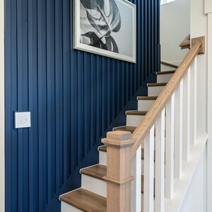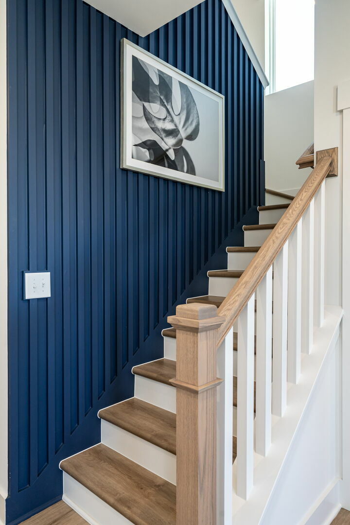 Navy slat panel walls in the family room and along the staircase, as well as a stunning hand painted floral mural in the half bathroom are sure to impress.