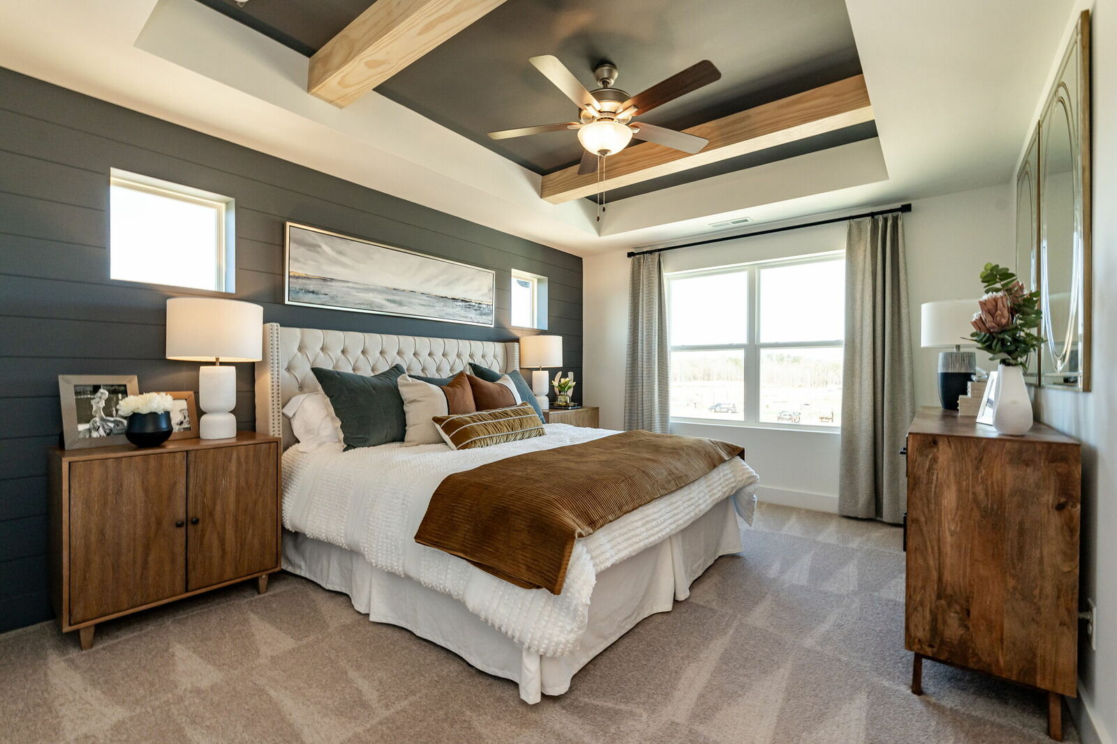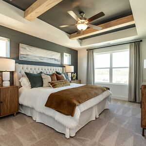 A tray ceiling and wood beams add charm to the luxurious Owner’s Retreat, complete with a pamper-ready Owner’s Bath.
