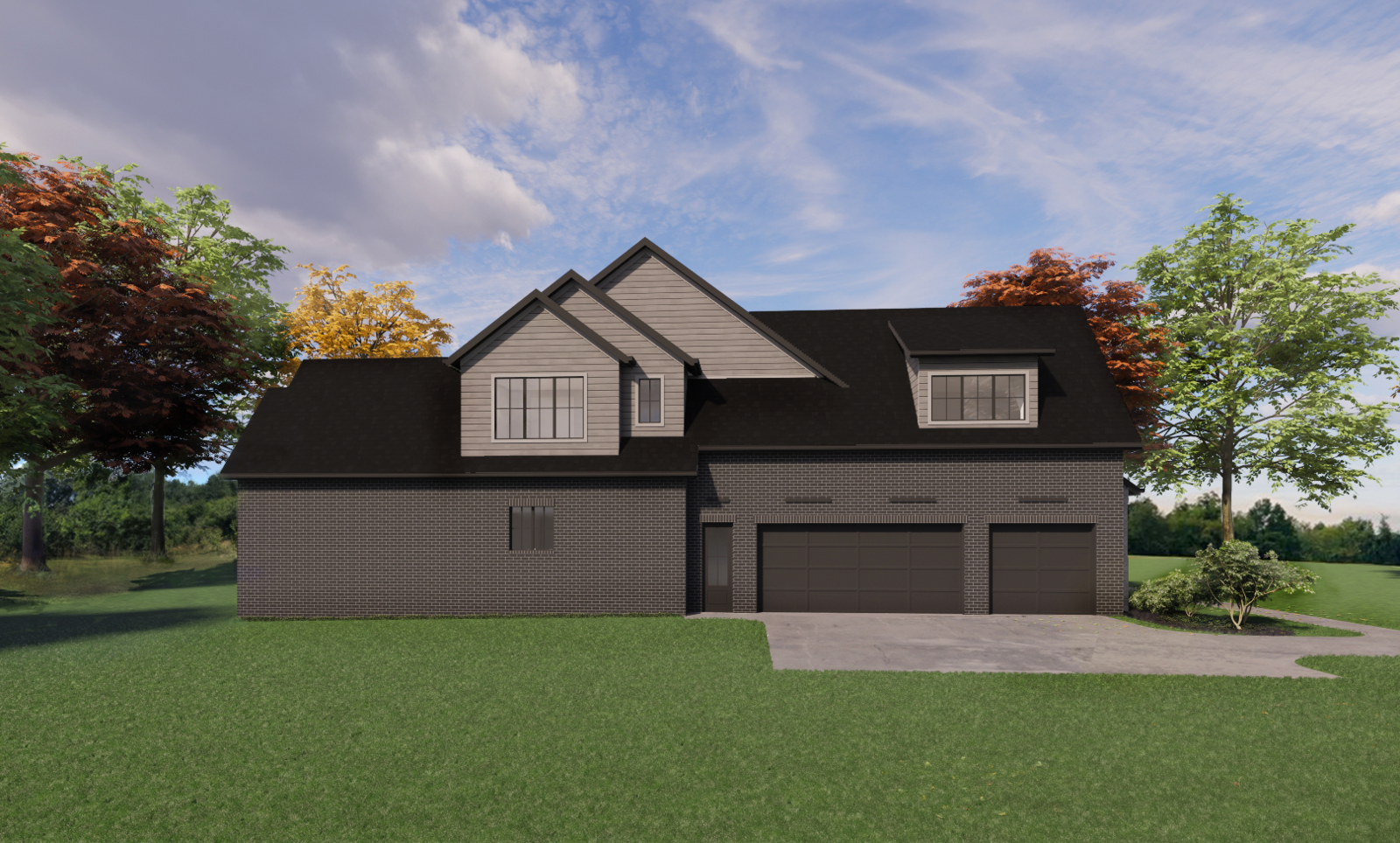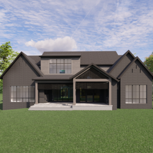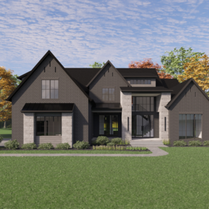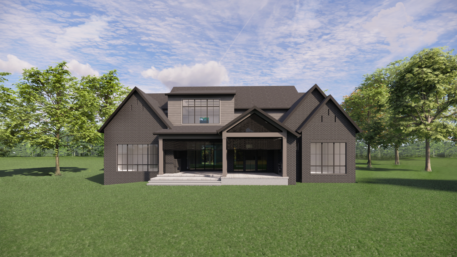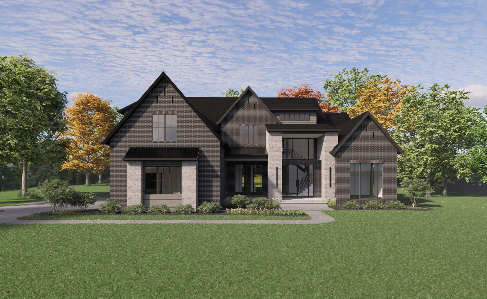 Modern style exterior bending black brick, fiber cement siding, and Cultured Stone accents. Dramatic white oak staircase with tape lighting and cable railing. Oversized steel 9’ x 9’ front door and sidelights and electrified glass, which can go from clear to obscure with the press of a button. Great room adorned with a linear fireplace and natural stone hearth with stone accents. Office with oversized windows and a dramatic dropped ceiling detail with tape light accents. Bonus/media room with a wet bar and half bath accessible from the bonus. Outdoor living area with retractable screen, outdoor kitchen, and fireplace.