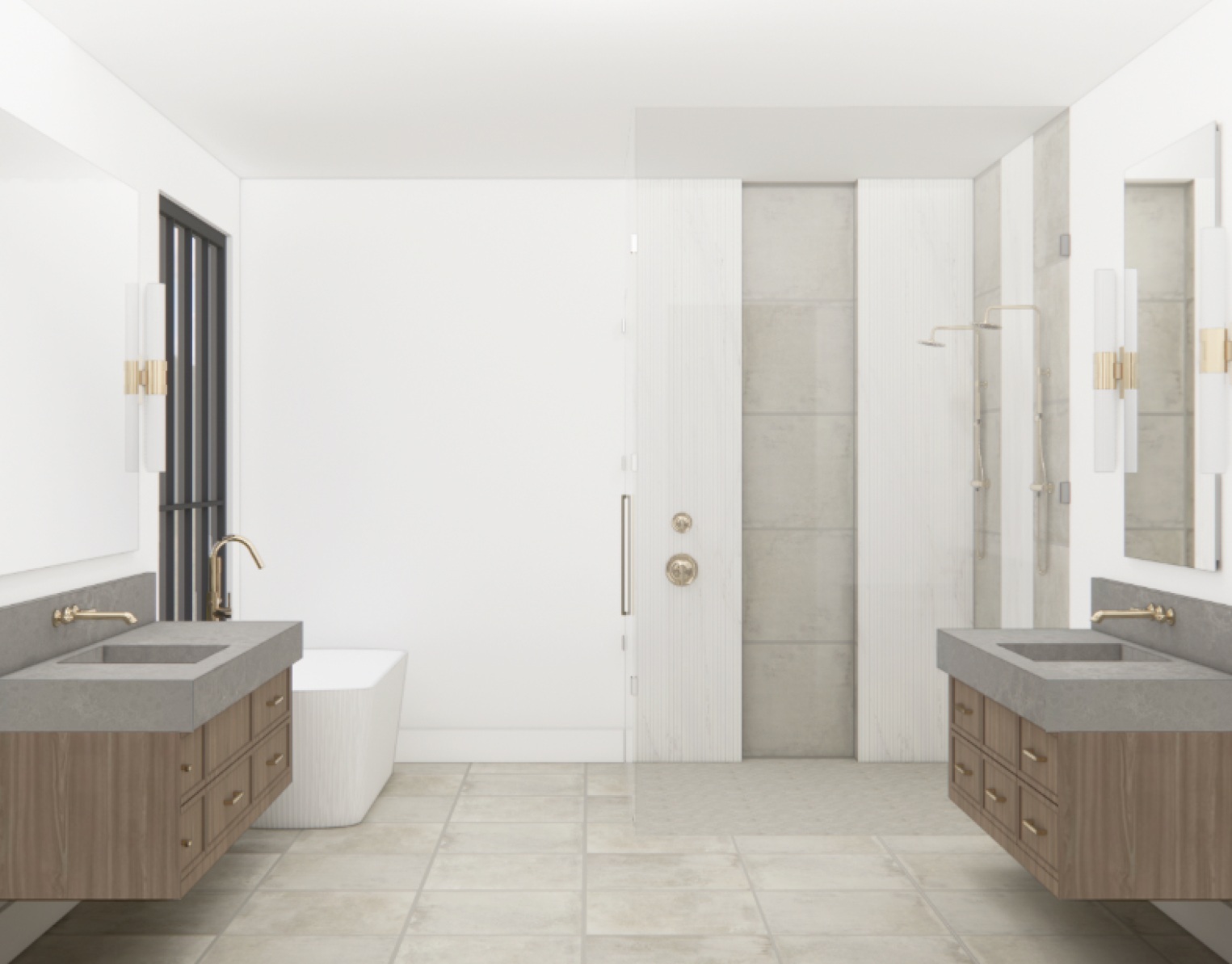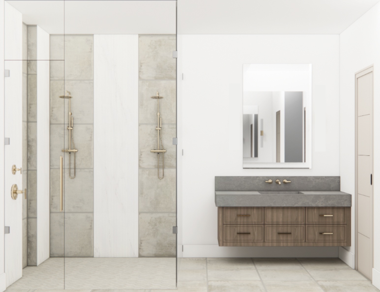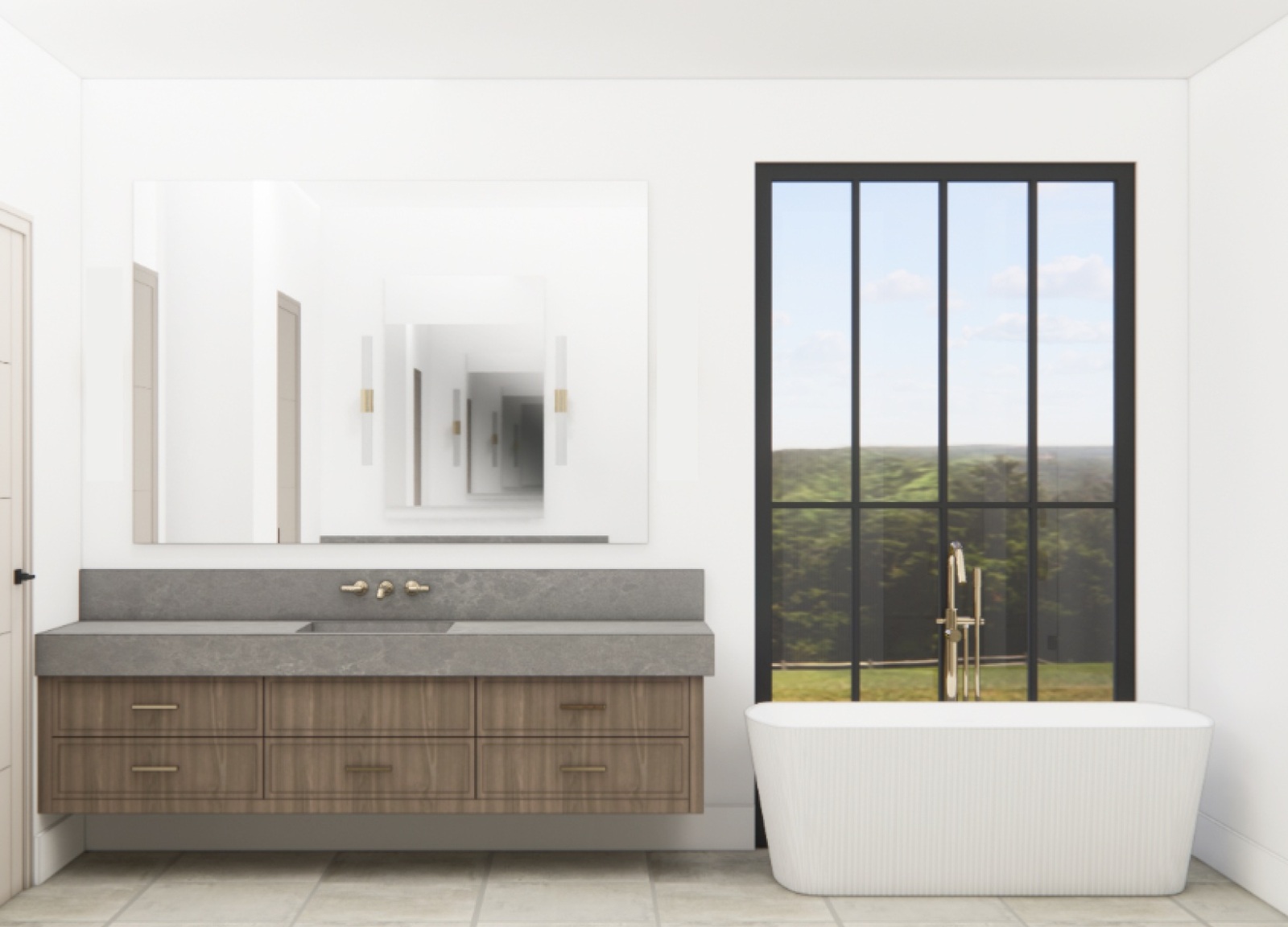Modern style exterior bending black brick, fiber cement siding, and Cultured Stone accents. Dramatic white oak staircase with tape lighting and cable railing. Oversized steel 9’ x 9’ front door and sidelights and electrified glass, which can go from clear to obscure with the press of a button. Great room adorned with a linear fireplace and natural stone hearth with stone accents. Office with oversized windows and a dramatic dropped ceiling detail with tape light accents. Bonus/media room with a wet bar and half bath accessible from the bonus. Outdoor living area with retractable screen, outdoor kitchen, and fireplace.