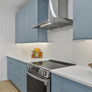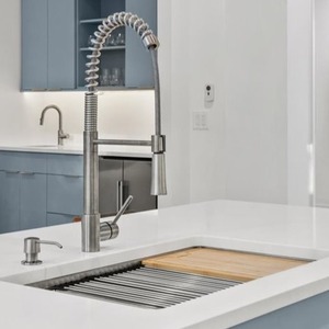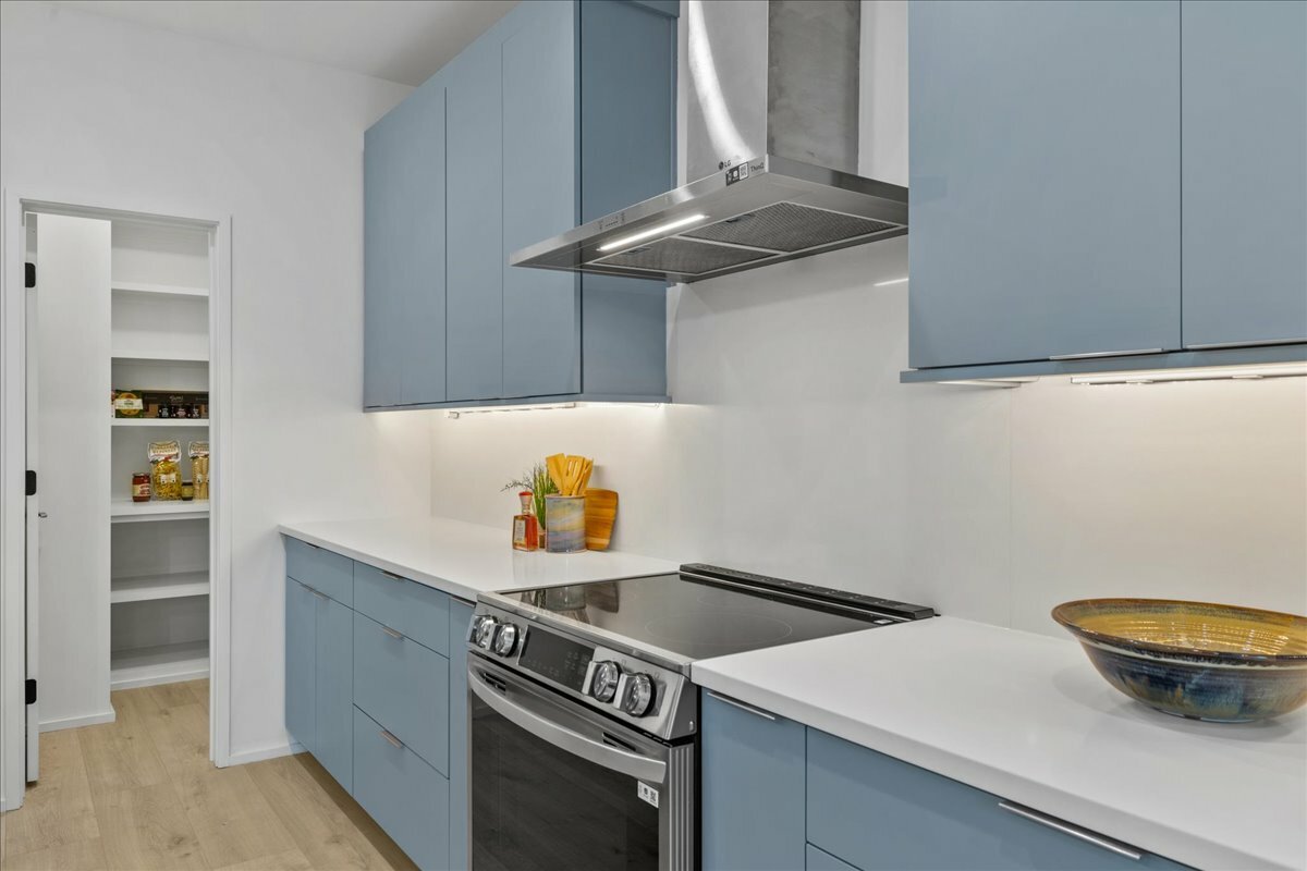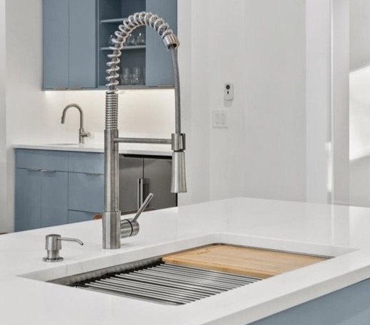 Quartz countertops and hidden outlets on backsplash