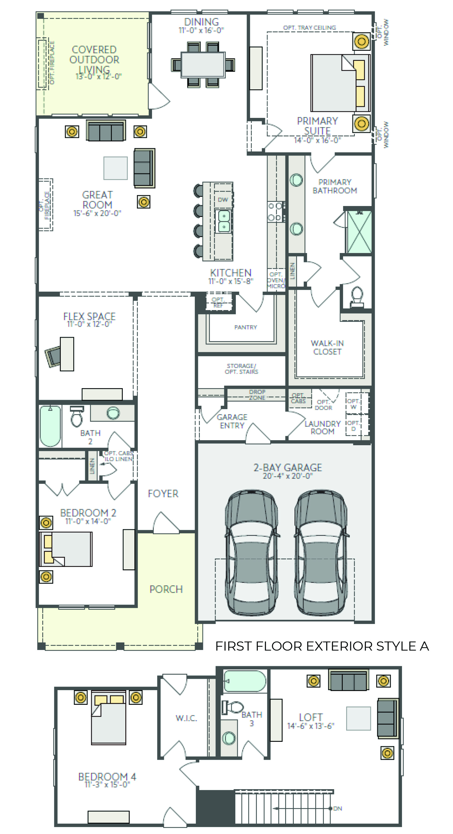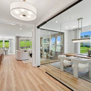 This 2–4 bedroom home offers flexibility and function for any lifestyle. A flex space off the entry—optionally enclosed with a glass wall—is ideal for a home office. The open-concept kitchen, dining, and great room include a gourmet kitchen, prep zone, and fireplace. Two 9080 sliding glass doors at the great room and dining room lead to a spacious covered patio with an optional fireplace. The primary suite features a tray ceiling, upgraded bath, and an optional door connecting the walk-in closet to the laundry room. Add a second floor with a loft, stairs, and a fourth bedroom for extra space.